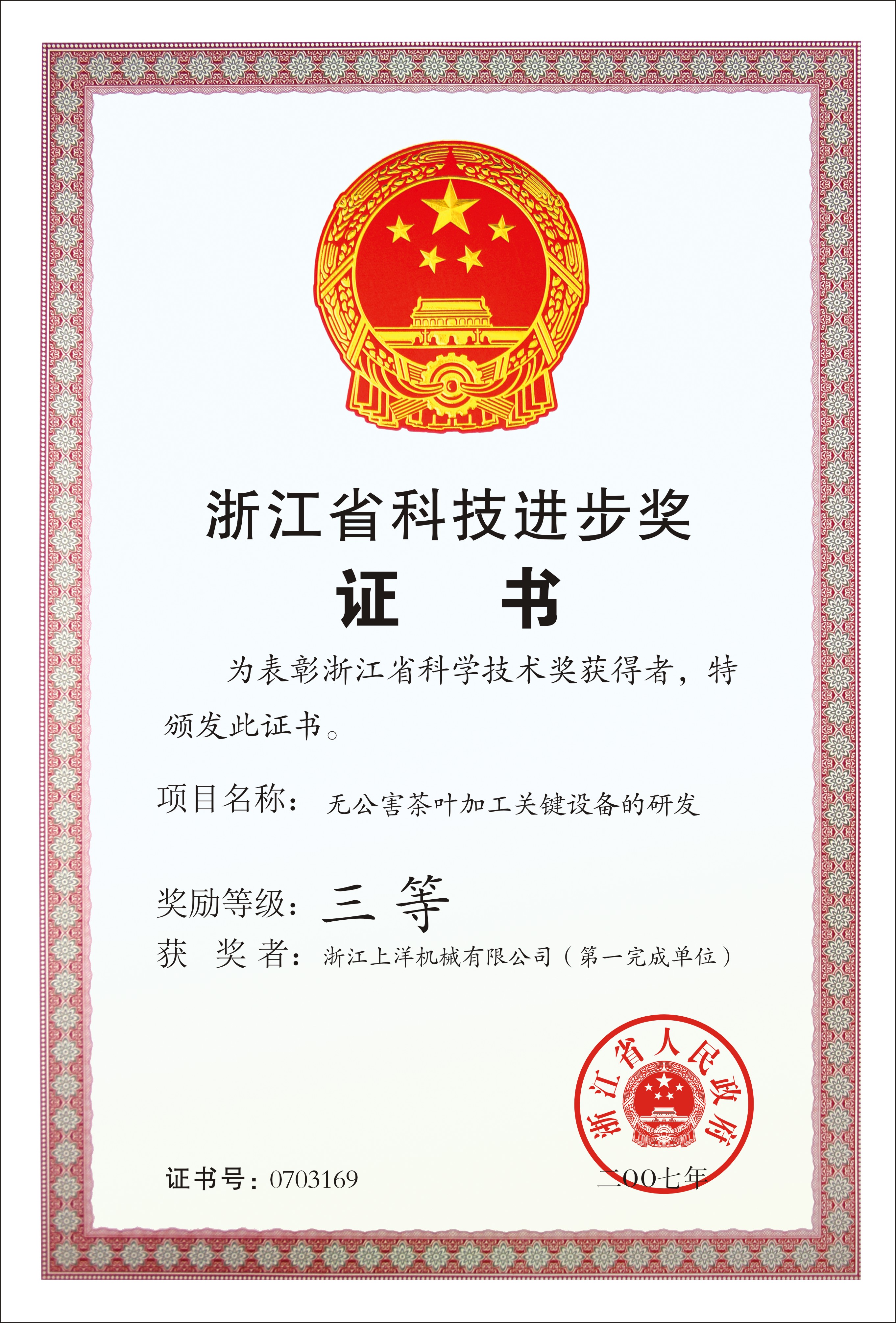 2007年浙江省科技進(jìn)步三等獎