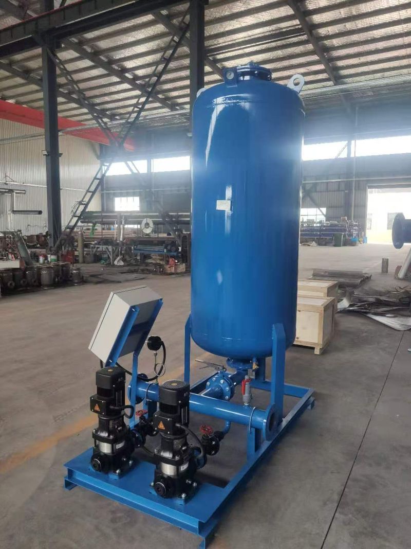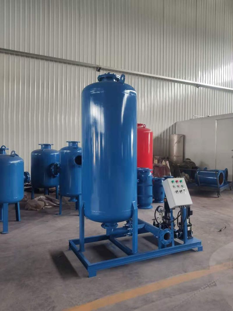 定壓樸水裝置利用氣體的可膨脹性進行工作。當定壓補水裝置經(jīng)過安裝完成后,就可以對壓力開關(guān)上限P2(水泵停止壓力 )、下限P1(水泵啟動壓力)及壓力數(shù)值進行設(shè)定(具體設(shè)定值可根據(jù)客戶要要設(shè)定),上述工作完成后可接通電源開始供水。啟動水泵,向建筑物管網(wǎng)和穩(wěn)壓罐內(nèi)充水,由于水是不可壓縮的液體,隨著水量不斷增加,水室的體積也不斷擴大.囊形隔膜不斷向外擴張而擠壓氣室,使其體積不斷縮小,罐內(nèi)的圧力也不斷增高,當達到設(shè)定的壓力P2時,則水泵自動停泵。由于系統(tǒng)中水的體積減小,系統(tǒng)壓力降低時,罐內(nèi)的氣體膨脹,將囊中的水壓回系統(tǒng)。這樣水室體枳不斷縮小,囊形隔膜不斷收縮,當水室內(nèi)水幾乎用完時,罐內(nèi)壓力降到設(shè)計壓力P1,此時壓力開關(guān)碰到設(shè)定*低壓力觸點,水泵則自動開啟,使水又充入管網(wǎng)及水室,如此重復(fù)上述過程,保證給水系統(tǒng)的用水。以上的運轉(zhuǎn)過程是由壓力開關(guān)遇過電氣控制箱控制水泵啟停而得以實現(xiàn)的。