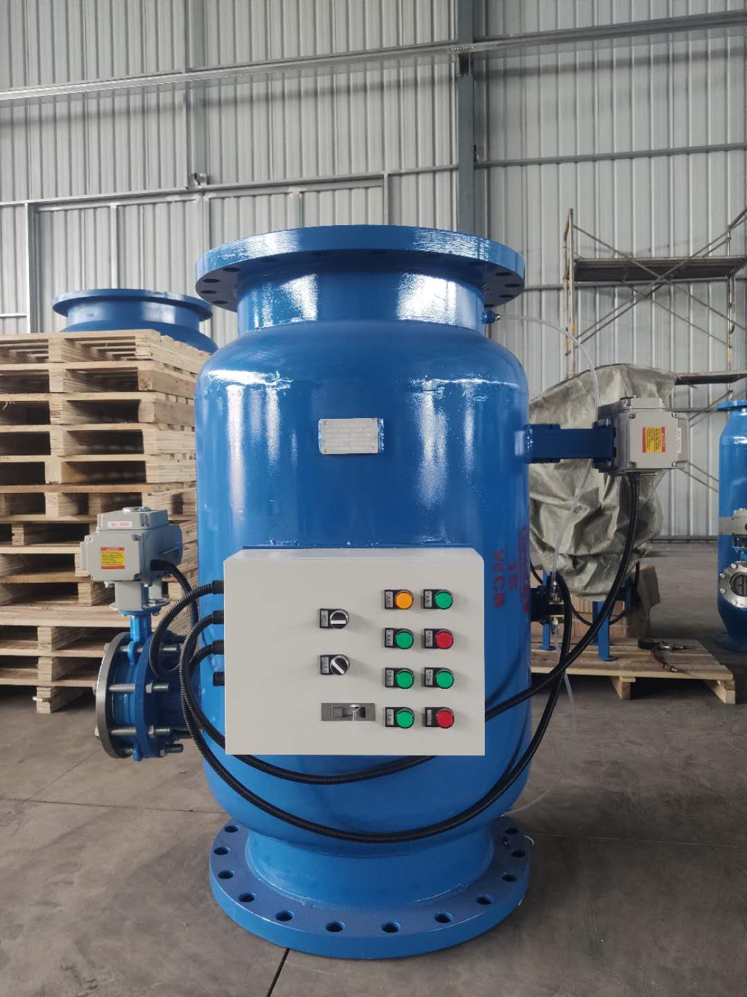 反沖洗過(guò)濾器主要由**碳鋼筒體,過(guò)濾組件,水流導(dǎo)向閥和排污裝置所組成,當(dāng)過(guò)濾器工作時(shí),水流導(dǎo)向閥處于開(kāi)啟狀態(tài),水流自入口進(jìn)入過(guò)濾器,經(jīng)濾網(wǎng)過(guò)濾到出口,水中污物雜質(zhì)等被濾網(wǎng)攔截。當(dāng)過(guò)濾器需要排污時(shí),關(guān)閉水流導(dǎo)向閥,打開(kāi)排污閥,水流經(jīng)濾網(wǎng)前半程過(guò)濾,一部分水經(jīng)過(guò)濾后直接流入系統(tǒng),另一部分水由濾網(wǎng)外側(cè)流入內(nèi)側(cè),不斷沖刷濾網(wǎng)內(nèi)壁上的污物,并經(jīng)排污口排出,起到反向自動(dòng)沖洗濾網(wǎng)和排出污物的作用,整個(gè)反沖排污過(guò)程不用關(guān)閉系統(tǒng),無(wú)需人工進(jìn)行清洗濾芯,實(shí)現(xiàn)了在線排污。