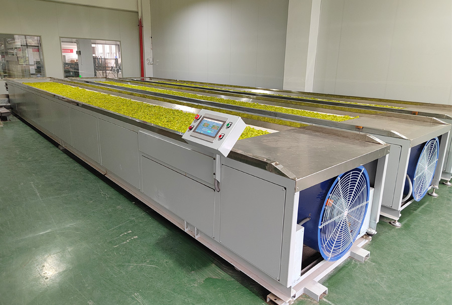 作業(yè)原理:單層式結(jié)構(gòu),機組采用的集中控制系統(tǒng)可精準(zhǔn)控制鼓風(fēng)時間、風(fēng)量、溫度、攤?cè)~厚度/重量等主要參數(shù),實現(xiàn)攤青(萎凋)的均勻充分。 利用光電定位系統(tǒng),能有效檢測茶葉流量,可自動控制茶葉進(jìn)入下一步工藝流程。